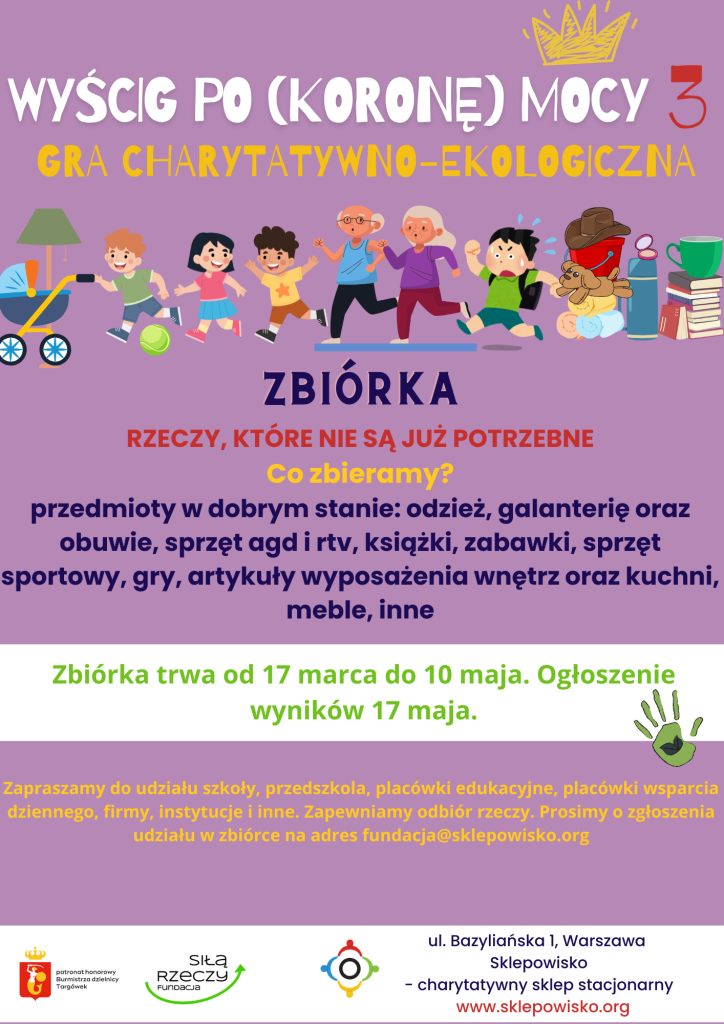 Zapraszamy do udziału w III edycji gry charytatywno-ekologicznej „Wyścig PO(koronę)MOCY”. W tym roku akcja ponownie otrzymała Honorowy Patronat Burmistrza Dzielnicy Targówek (właściwego dla siedziby Fundacji). Gra ma formę zbiórki niepotrzebnych przedmiotów. Zbiórka dotyczy rzeczy używanych, które są w dobrym stanie: ubrań, książek, zabawek, akcesoriów szkolnych, ale też kuchennych czy elementów wyposażenia wnętrz, mebli. Oczywiście nowe przedmioty też są mile widziane. Zapewniamy odbiór rzeczy z Państwa placówki.